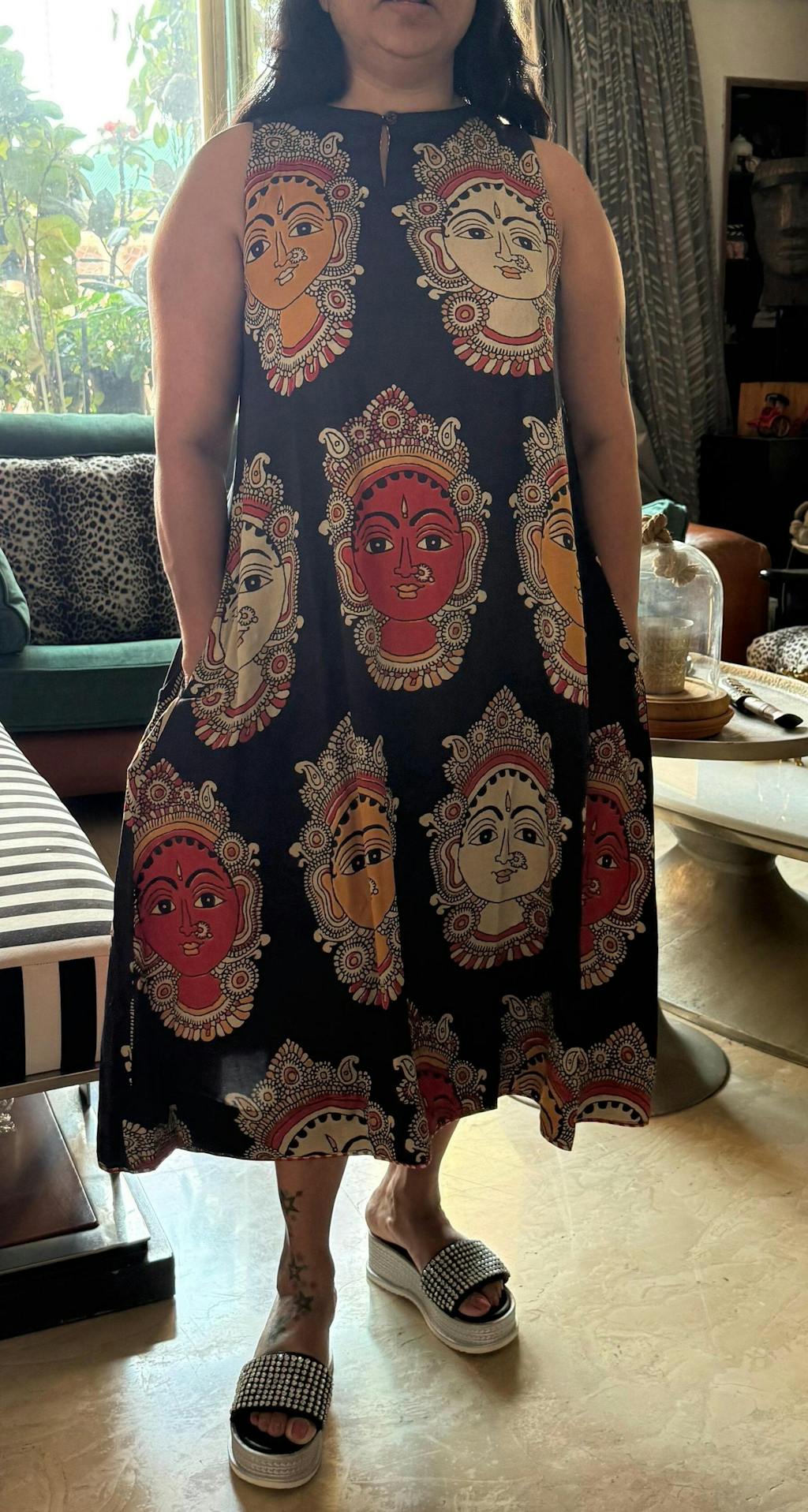 Fit and Flare. The model is of bust size 32” and height 5’4”, and is wearing size XS.