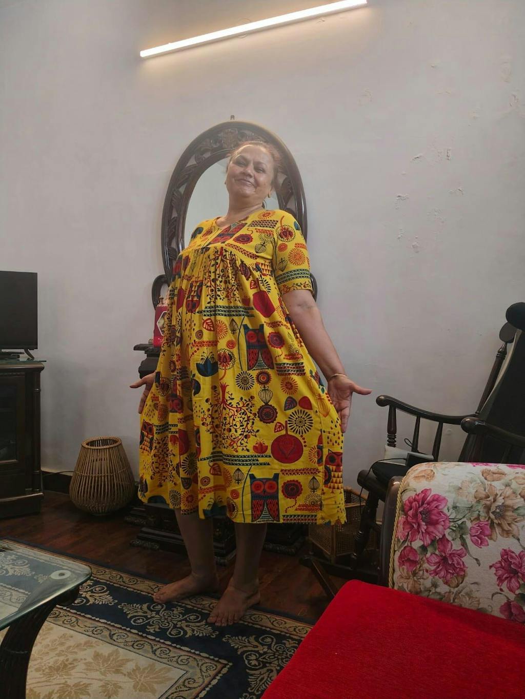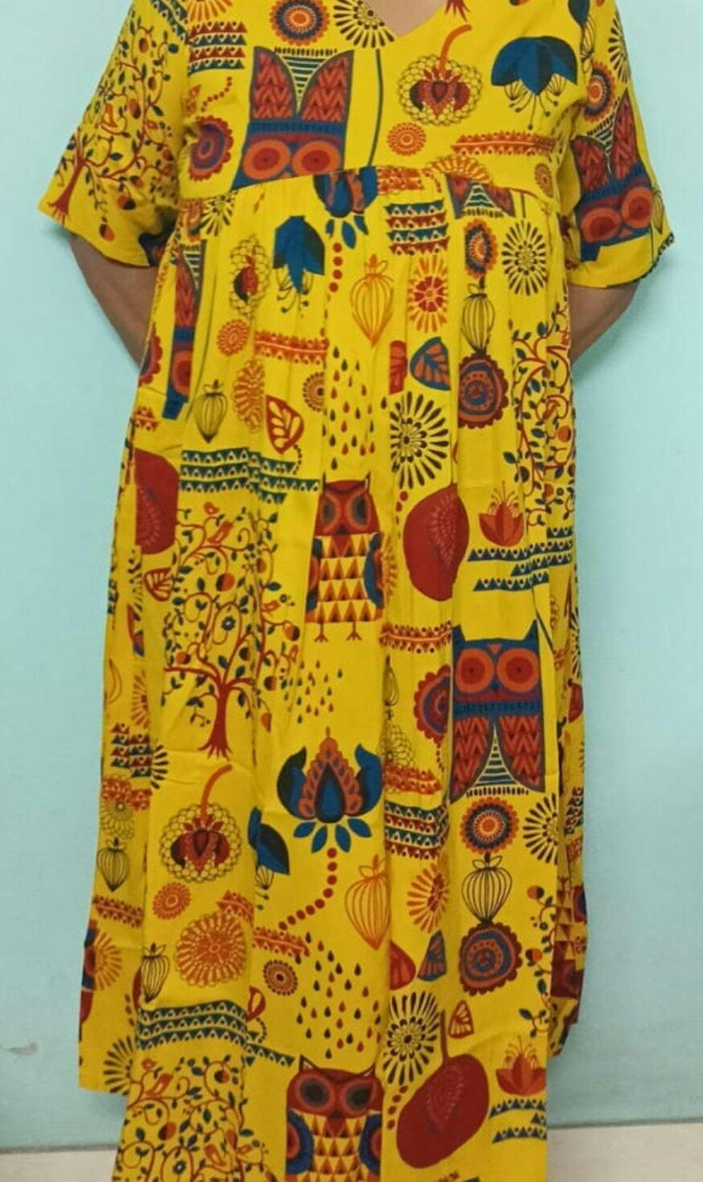 Coincide your ethnic style with contemporary silhouette with this adorable dress. Looks great for work wear as well as for casual lunch parties. The silhouette flaunts v neckline with gathers at the yoke. Team up this dress with earrings and heels.