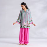 • It is paired with a traditional farsi salwar, fully elasticated for ease of movement and all-day comfort