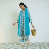 Ocean Blue Sanganeri Printed Cotton Kurta Set with Contrast Mul Cotton Dupatta