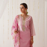 Pink Embroidered Chanderi Kurta Pant Dupatta Set with Gota Details