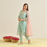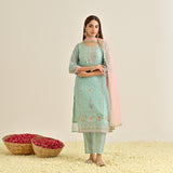 Powder Blue Floral Straight Kurta Set with Yoke Embroidery & Dupatta
