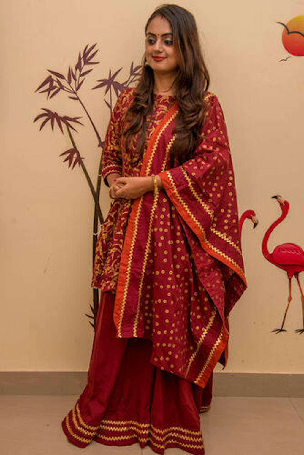 Want to stage that million-dollar look at your friend's wedding? Comfortable and stylish at the same time, this Maroon Festive Gold Printed Sharara Peplum Dupatta Set will help you do the trick! Worried about the holiday weight? This peplum kurta is designed to play down some areas and accentuate others to give you a shapely look. This rich maroon kurta set for women can be paired with thick gold jhumkas for maximum effect. Designed to offer quality, this is a must-buy!