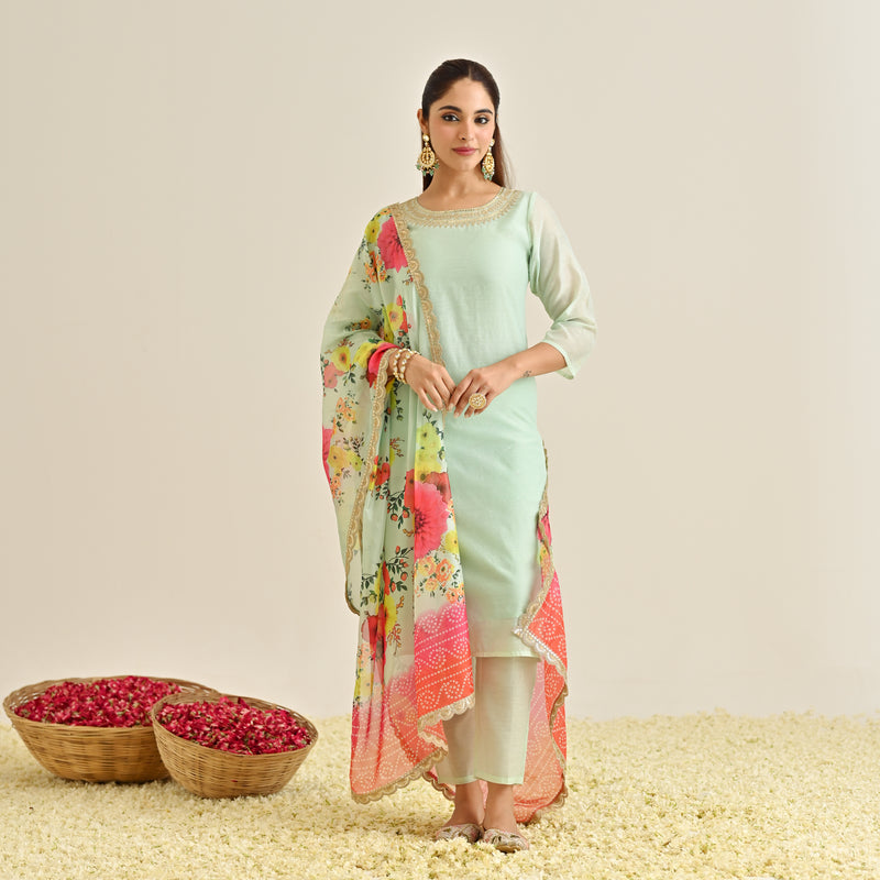 Mint Festive Embroidered Kurta Set with Printed Dupatta & Round Yoke Detail